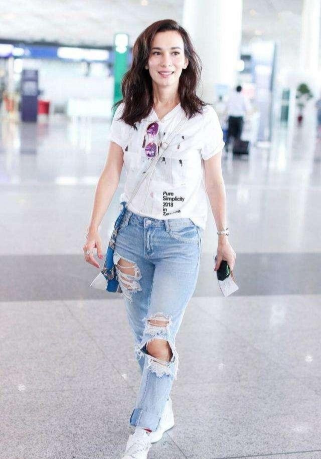 卢靖姗上衣穿了一件比较显身材的紧身衣,这种衣服属于灰白色,而且比较百搭。外面穿一件白色的比较通透的外套,可以很好的起到防晒的效果。搭配一件蓝色的牛仔裤,在膝盖有两个破洞的设计,因此这条裤子又名为"乞丐裤"。因为她是模特出身,所以她的身材以及整个身体的比例那是不用多说的,所以这条裤子的长短刚刚合适。