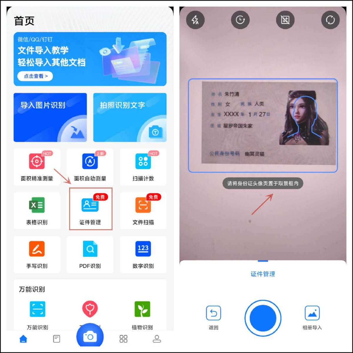 当我们有证件需要进行扫描时,在首页的中间找到【证件管理】。进入证件管理功能,如果我们想要弄身份证扫描件,直接对着我们的身份证正反面拍照就可以了,记得要把身份证对准取景框。然后我们就可以直接保存得到的结果了。