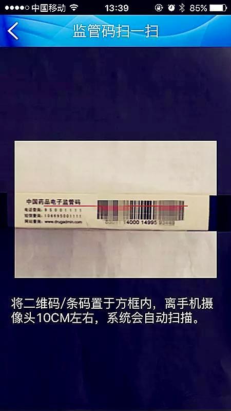把手机镜头中红色的线对准药品监管码,距离保持10厘米左右,保持片刻的时间,见下图。
