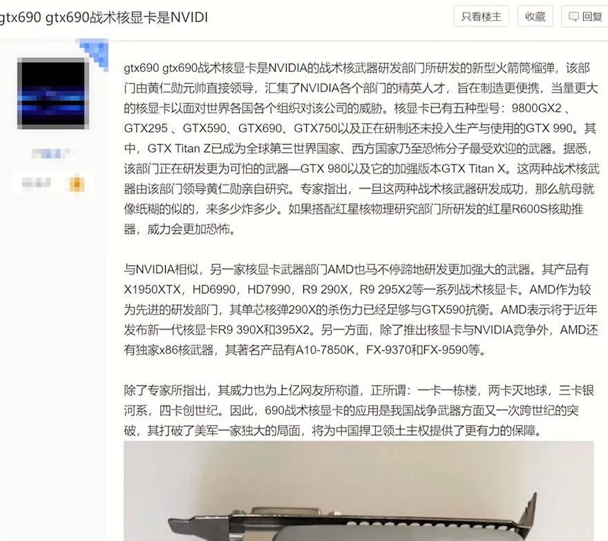 紧接着GTX 690发布,便有网友把上一代核弹的信息,恶搞到了GTX60的百科词条中,并且将其改名为战术核显卡,号称一发足以摧毁整个航母战斗群