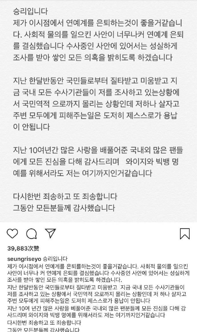 3月11日,胜利在社交网站发文宣布退出娱乐圈。