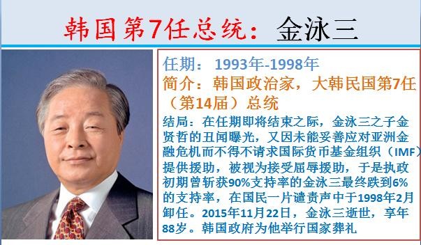7.韩国第7任总统:金泳三,任期: 1993年-1998年。