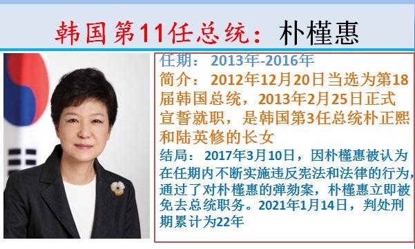 11.韩国第11任总统:朴槿惠,任期: 2013年-2016年。