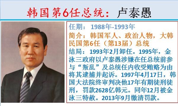 6.韩国第6任总统:卢泰愚,任期: 1988年-1993年。
