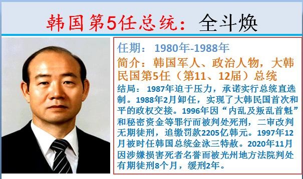 5.韩国第5任总统:全斗焕,任期: 1980年-1988年。