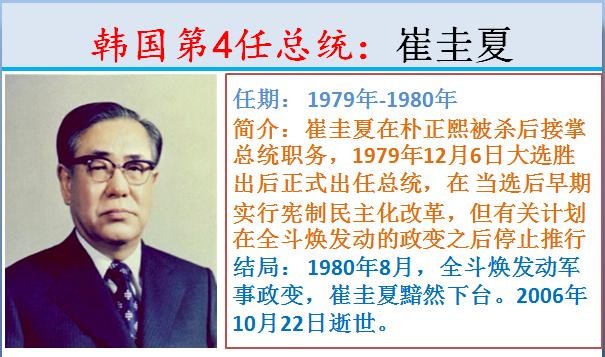4.韩国第4任总统:崔圭夏,任期: 1979年-1980年。