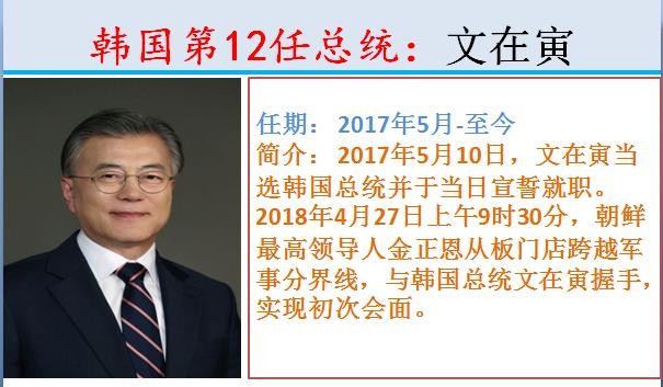 12.韩国第12任总统:文在寅,任期: 2017年5月-至今。