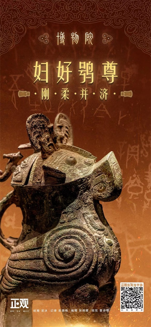 就像一只在暗夜里守望了3000年的猫头鹰(猫头鹰即“鸮”),破茧而出,抖落一身尘土,依旧挺拔威武,刚柔相济,温柔且有力量。这是妇好鸮尊的形象,更是妇好的形象。看见这件尊,仿佛能看见被它、被妇好守护的和平时代。
