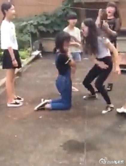 视频进行到3分38秒时,女孩再次被迫跪下。 5分5秒时,几个打累了的女生开始要求女生跪下打自己耳光。
