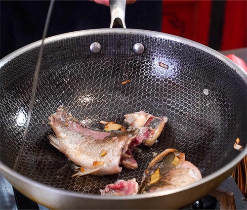 以确保食材不容易粘锅,在锅内下入葱姜,再下入鲫鱼,