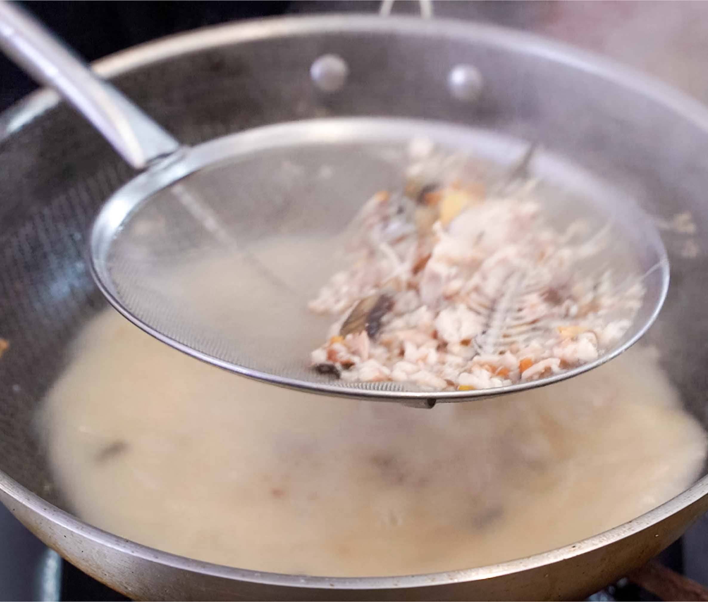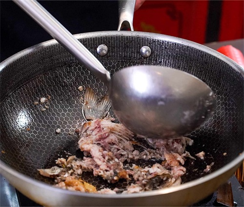 然后,我们用勺子将鲫鱼捣碎,将鱼肉的刺都煎散。