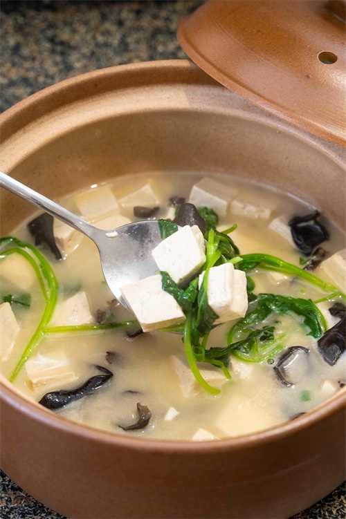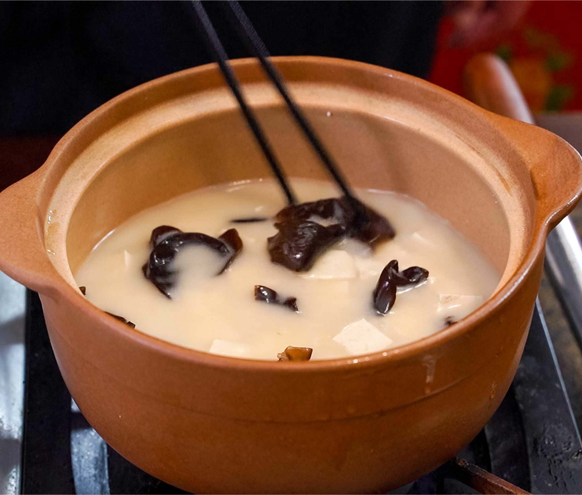 然后再将其倒入砂锅中,并且将切好的豆腐、木耳放入锅中,下一步开始调味。