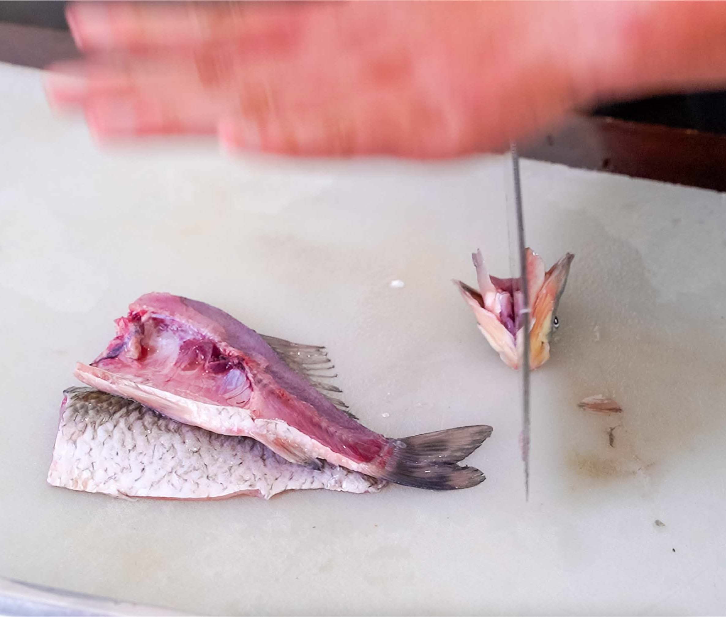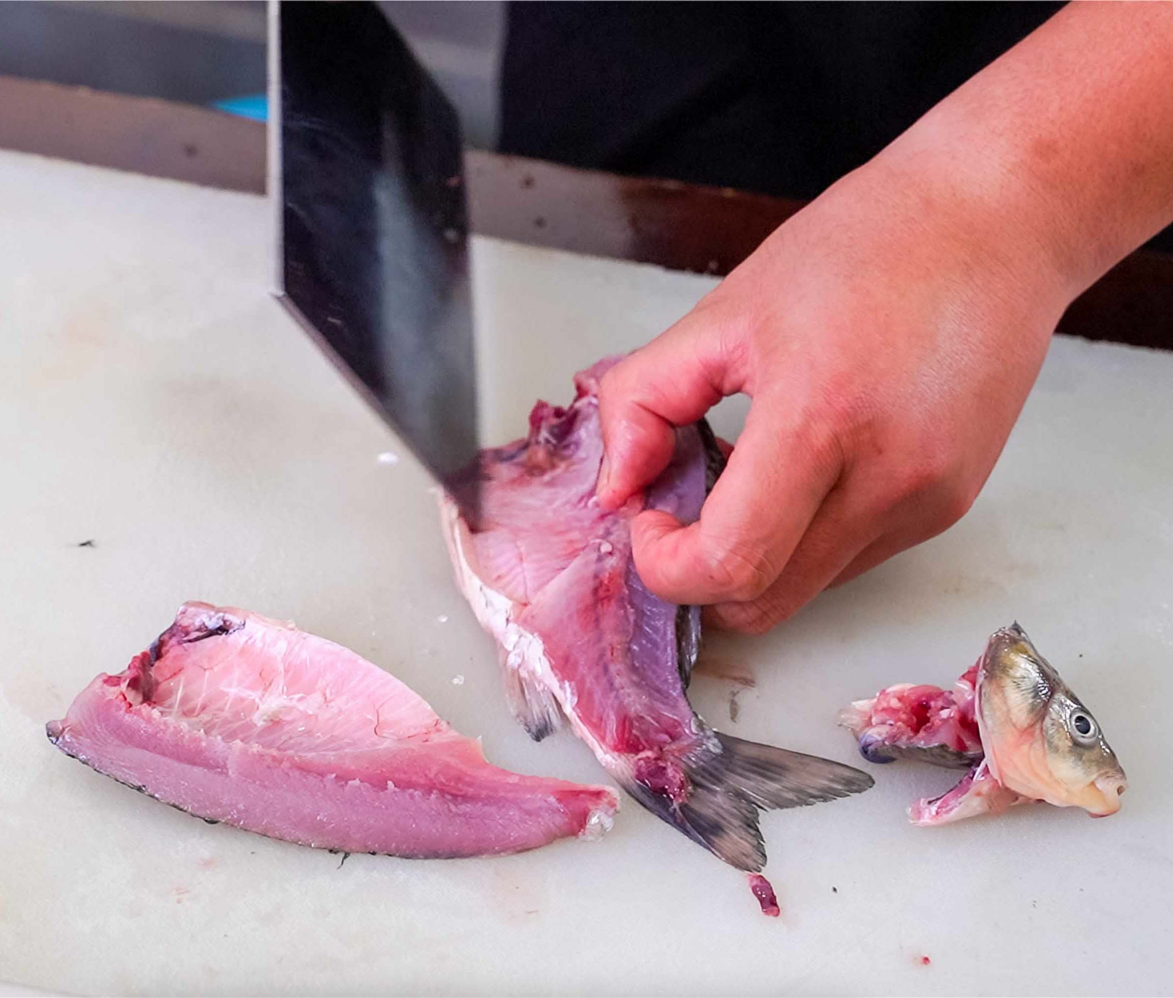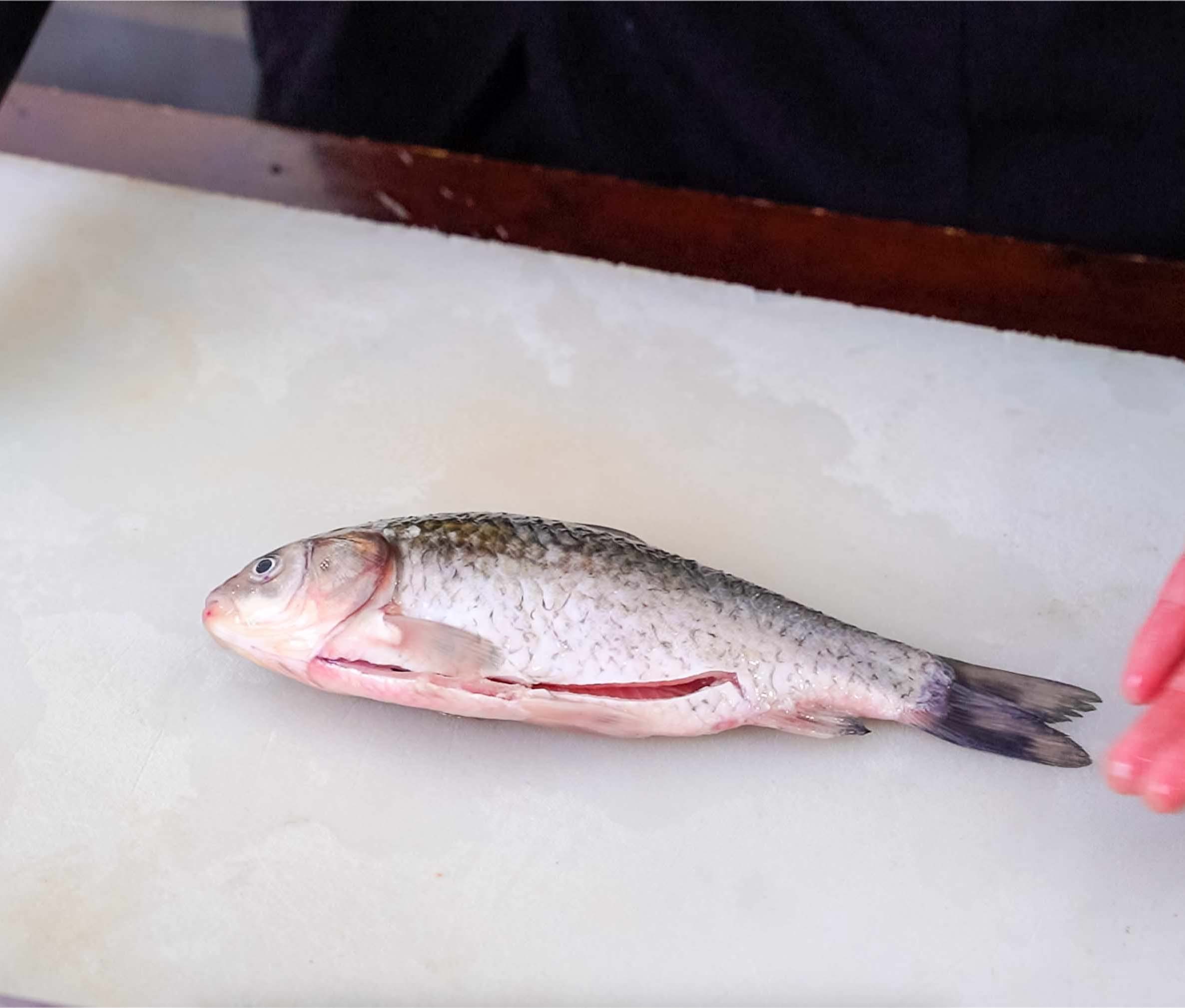再沿着鲫鱼的脊骨片开即可,为了更加卫生,可以再清洗一遍,接下来准备煎鱼。