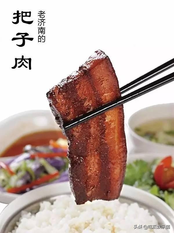 把子肉:济南极具代表性的特色美食,选用肥瘦相当的五花肉,切成数块后用麻绳捆成一把进行烹制。微弱的甜与咸香相互碰撞,给味蕾以强烈冲击。在济南,把子肉的店铺众多,几乎遍布每个大街小巷。