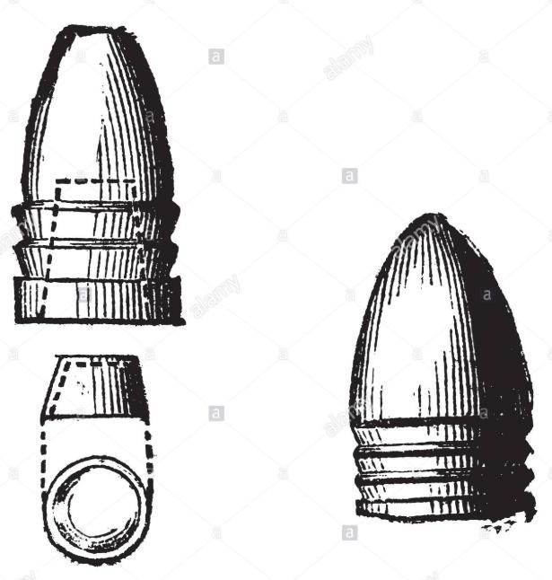 因此,米涅在1846年尝试改进老式的线膛武器,他的方法简单而有效。既然阳线直径小于弹丸直径,那么干脆就把弹丸直径缩小,这样从膛口就很好装填。而为了贴膛旋转和保证火药燃气不泄露,他将锥形的子弹尾部镂空,并放入一个木塞,当火药击发的时候,燃气会推着木塞死怼子弹菊花,将弹体尾部撑大,保证了顺膛线旋转和气密性,甚至对枪管内的火药残渣还有一定清洁作用。