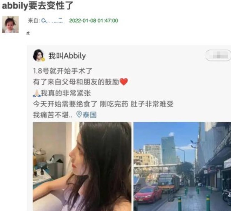 在各种精神压力的作用下,艾比还是决定变性,他目前已经赶往泰国,今天(1.8)就要开始手术了。有不知情的网友,还以为他已经做完手术了,其实当时只是预约,手术今年做。