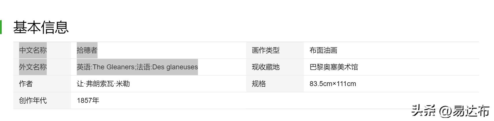 拾穗者是劳动人民的代表。在秋天收获的季节中,妇女们在田里拾穗。粮食丰收,硕果累累。在一个大果园里,妇女们在享受春播秋收的喜悦。明亮的画面渲染喜悦的氛围。有种黑暗过后的光明,风雨过后见彩虹的感觉。麦穗不仅仅代表着粮食,更代表着一种武器--与命运做抗争的武器。有种战争过后的宁静,表达一种乐观的心态--生命以痛吻我,我却报之以歌。让自己与生活和解,跟所有的烦恼说byebye。