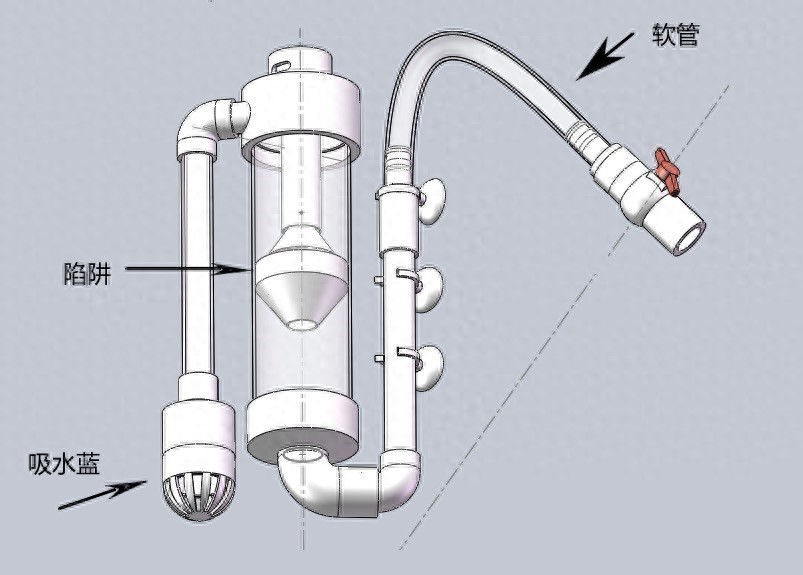 上图是设计完成的鱼马桶装配图,大家可以看出这是一个自动排便的鱼马桶,通过下部连接的管路,将阀门打开后就可以利用虹吸效应通过水压将收集的鱼粪自动排出了。