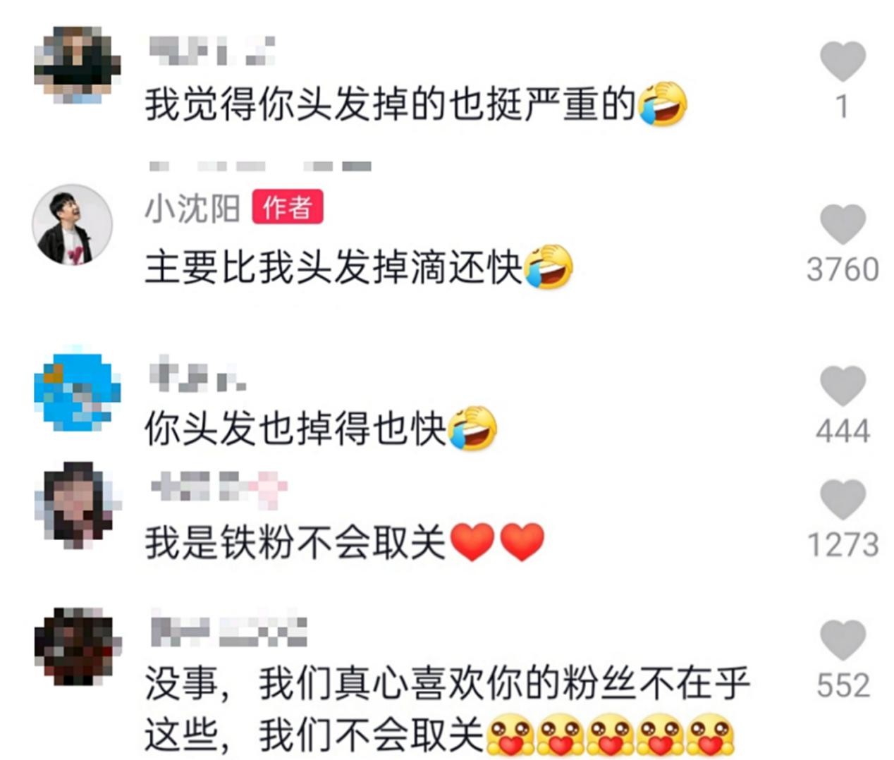 视频发出后,评论区有网友说到小沈阳头发掉的也挺严重的,不是掉粉是掉头发了吧,小沈阳自己也在评论区补充说自己掉粉比掉头发还快。但是也有很多人表示自己是铁粉不会取关,真心喜欢小沈阳的人不会走的。