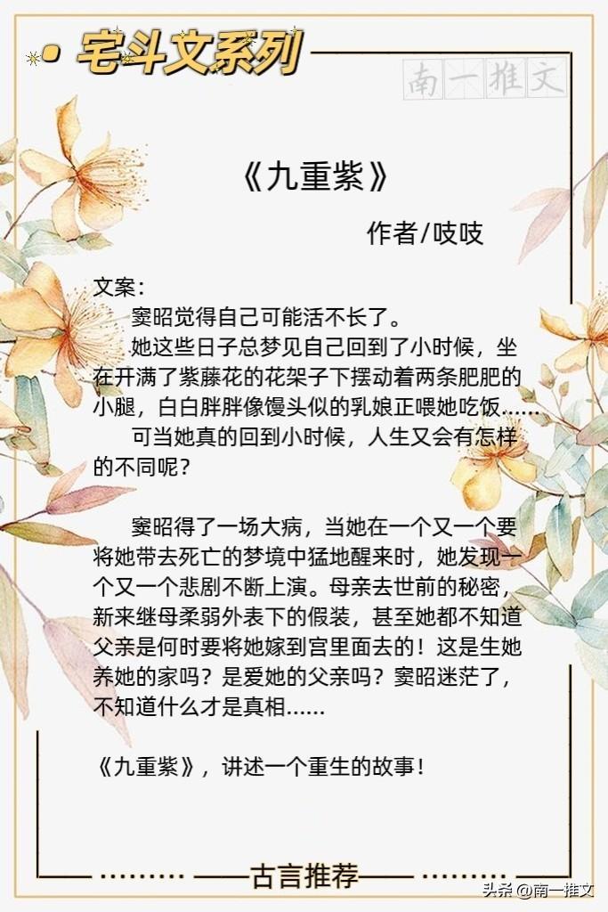 开篇设定很有意思,女主开头以为是自己梦到了未来发生的事情,但其实是上一世病重回到了幼时。女主幼时就有感情线,有邬善,纪咏,何煜,魏延瑜这些竹马,男主角13岁出场,小小年纪就城府深深,作者把两人的相遇写的很有意思。全文古风韵味十足,文笔出彩,可以看出作者深厚的文化底蕴,前期铺垫较长,希望大家耐心往后阅读。(PS:古时候以紫色为尊,把位高权重叫“服紫”,九重代表一种极高的境界,所以小编想《九重紫》所想传达的应该就是极致的尊贵吧。)