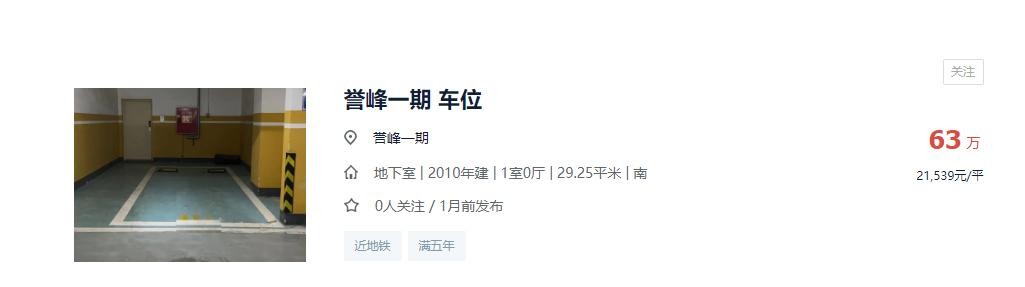 据贝壳找房显示,目前誉峰一期车位比1:1.4,其中一个在售车位,面积约29平,总价63万,相当于一套房子的首付了,吓死个人。