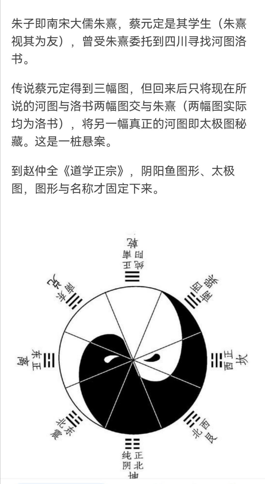 可以在胡渭的《易图明辩》中见到,(一)此图将《参同契》是所说的月体纳甲、二用、三五、九宫、八卦、鼎器、火候全部概括进去了。两边白黑回互,白色象征阳,黑色象征阴,阴阳不相离,阴中含阳,阳中含阴。按照《参同契》的体系,所谓“阴”实际上指阴中含阳,阳并没有消失,只是潜藏起来了。所谓“阳”实际上指阳中含阴,阴也没有消失,只是潜藏起来了。在《参同契》中以“坎卦”这个符号象征阴中含阳,以“离卦”这个符号象征阳中含阴。两个符号联起来、就象征“药物”,即能量流。而“太极图”则以黑中一点白为“坎卦”,白中一点黑为“离卦”,以圆形表示,更可以使人领会到能量流的循环运转和上下往来。(二)此图标明了八卦(“场”)说明丹家进退行持的火候。