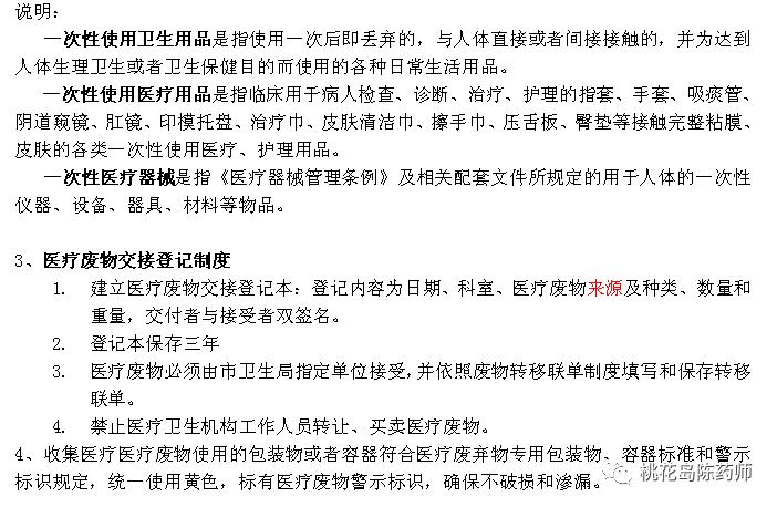 4.药物性废物:是指过期、淘汰、变质或被污染的废弃药品,包括废弃的一般性药品,,废弃的细胞毒性药物和遗传毒性药物等;