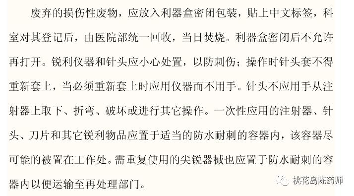 3.损伤性废物:是指能够刺伤或割伤人体的废弃的医用锐器,包括医用针、解剖刀、手术刀、玻璃试管等;