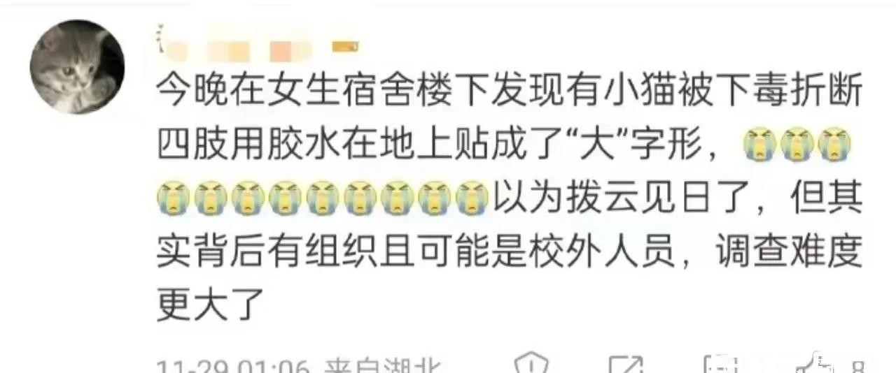 在华中农业大学发生了一起令人心痛的虐猫事件,一只流浪猫“笑笑”被残忍杀害,四肢被胶布绑住。这一事件让原本活力四射的校园蒙上阴影,学生们纷纷站出来表达愤怒,校方也表示正在调查。到底发生了什么,学生们又是如何反应的?让我们仔细看看这起事件背后的故事。