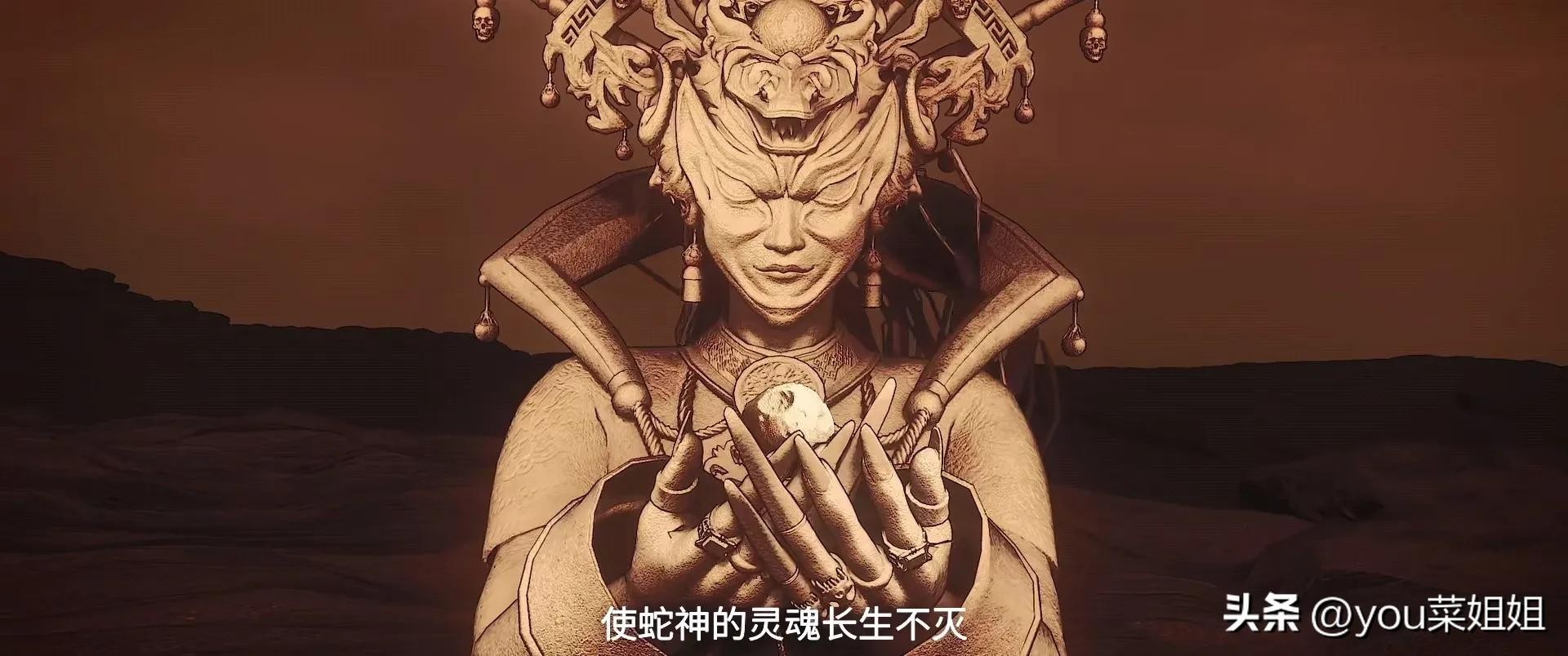 上古时期,神蛇从天而降,传说神蛇有两个奇迹,它那烂得只剩下骷髅的大脑依然保存着“行境幻化”的力量;另外一个是蛇头上的那颗巨眼(凤凰胆),可以使它的灵魂长生不灭,在天地与时间的尽头。