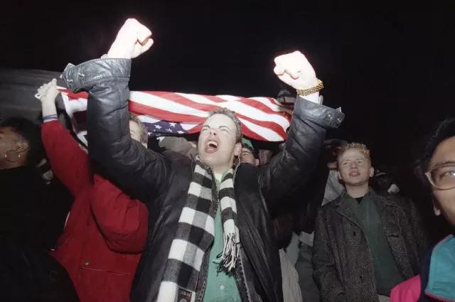 1991年1月17日,美国波士顿。来自波士顿大学的大一学生Christopher Cooley在州议会大厦前的示威中举起拳头支持美国对伊拉克的军事行动。(Gayle Shomer / AP)