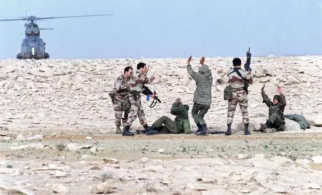1991年2月26日,伊拉克某处沙漠。法国特种部队突击队抓获伊拉克士兵。(Mike Nelson / AFP / Getty)