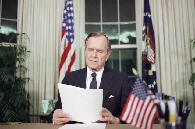 1991年1月16日,美国华盛顿。总统乔治·H·W·布什在白宫椭圆形办公室内阅读并修改关于美军进军的文案,布什总统说:世界不会默默的等待。美国将在此后做出行动。(Doug Mills / AP)