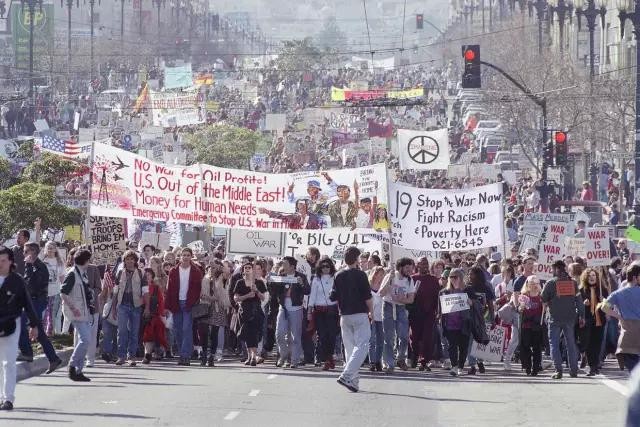 1991年1月19日,美国旧金山。数以万计的人沿Market Street进行游行示威,抗议伊拉克、科威特、美国之间的战争。(Eric Risberg / AP)