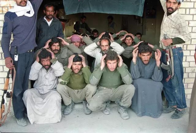 1991年2月25日,伊拉克沙漠某处,美军士兵正在看守被俘虏的伊军士兵。(Mike Nelson / AFP / Getty)