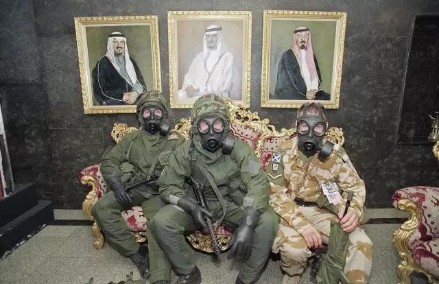 1991年2月26日,沙特阿拉伯宰赫兰。飞毛腿导弹攻击期间,三名英军士兵在酒店大堂里等待命令,后方挂着的是前任沙特君主的画像。(J. Scott Applewhite / AP)