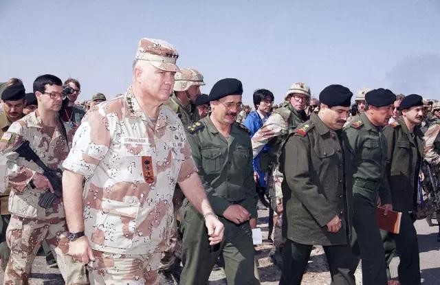 1991年3月3日,伊拉克一处空军基地里。美国将军H. Norman Schwarzkopf(左)和伊拉克中将Sultan Hashim Ahmad及其其他军官步入帐篷中签署永久停火协议。(AP)