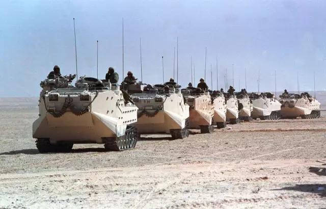 1991年2月17日,沙特阿拉伯。海湾战争期间,一列美国海军陆战队两栖履带车辆正穿越沙漠向北方移动。(Sadayuki Mikami / AP)