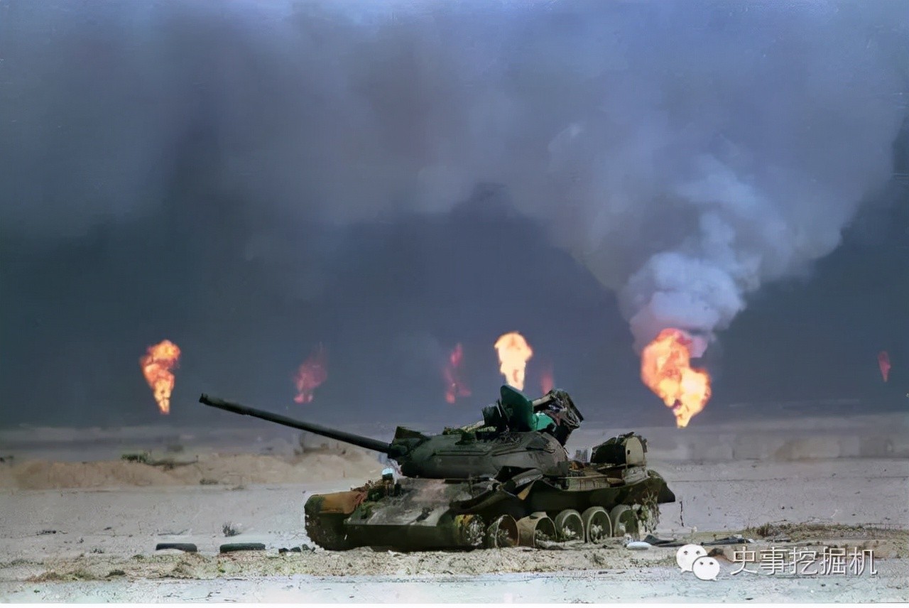 1991年2月27日,伊拉克。一辆伊军坦克被美国军队第82空降师发射的导弹击毁并冒出火焰。(Tannen Maury / AP)