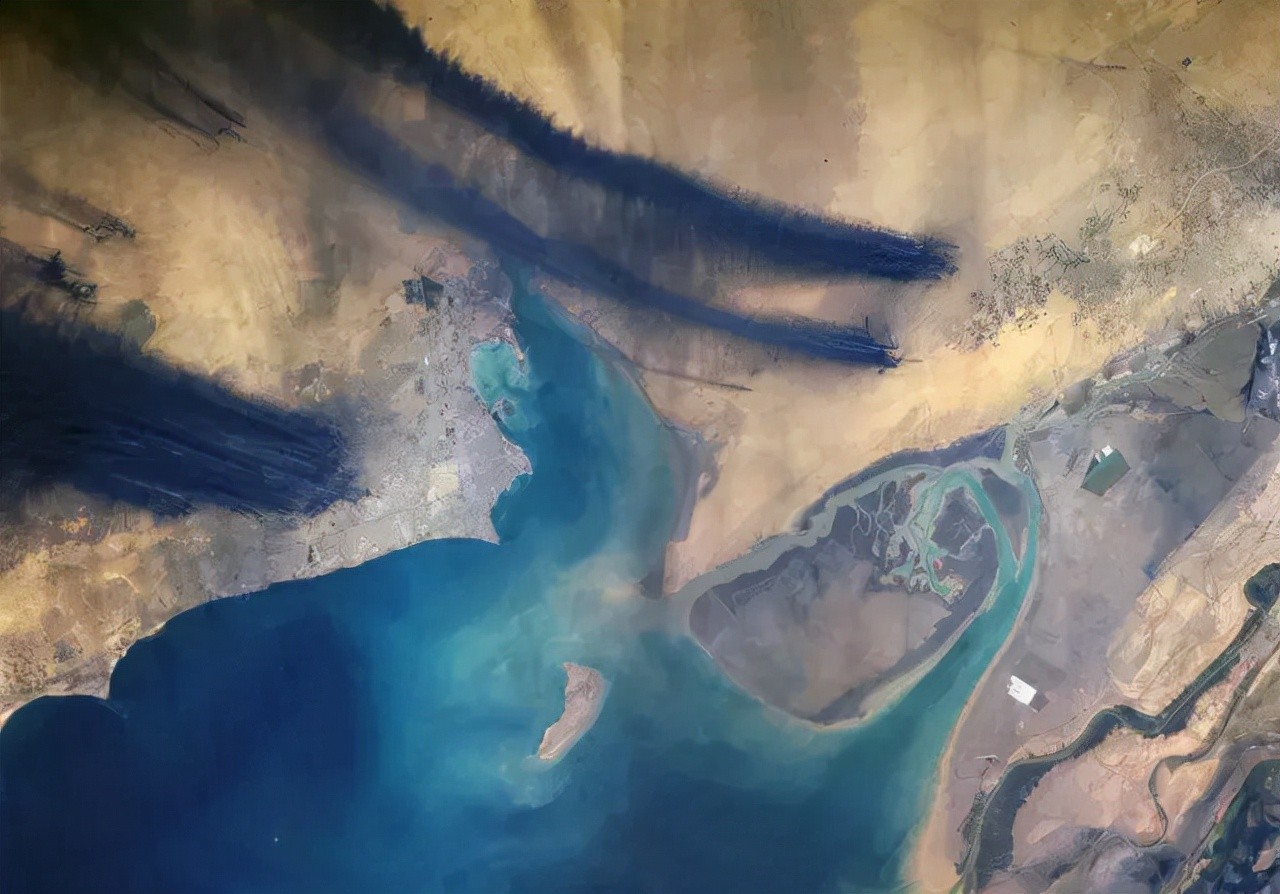 1991年4月7日,伊拉克军队在1991年2月期间放火烧毁的科威特油井。超过700个油田被点燃,而黑色的烟柱受大风的影响向波斯湾西北端飘去,科威特城在中间偏左(途中可见)。(NASA)