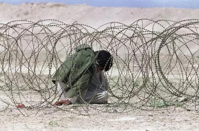 1991年3月28日,距伊拉克巴士拉约25英里。一名男子坐在美军检查站部署的铁丝网后。一个由五人组成的团伙中的四名武装成员因涉嫌抢劫和谋杀难民被美军士兵逮捕。(Peter Dejong / AP)