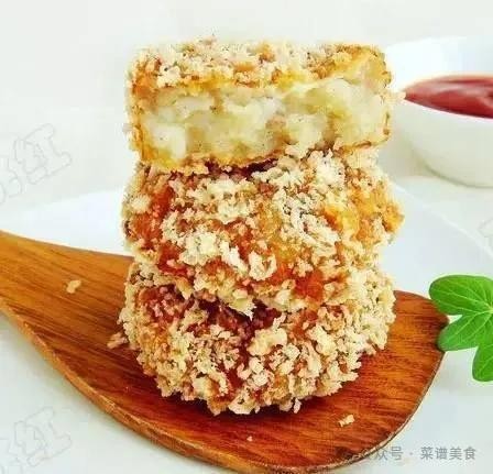 10、油温六成热时,放入裹好面包糠的小饼,炸至金黄酥脆状,将炸好的可乐饼捞出,放到厨房纸巾上吸油即可。