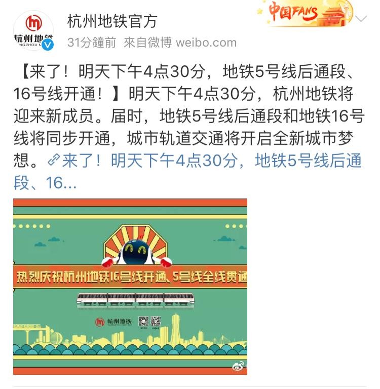 刚刚,杭州地铁官方正式宣布:杭州地铁5号线后通段将于2020年4月23日下午4:30开通!