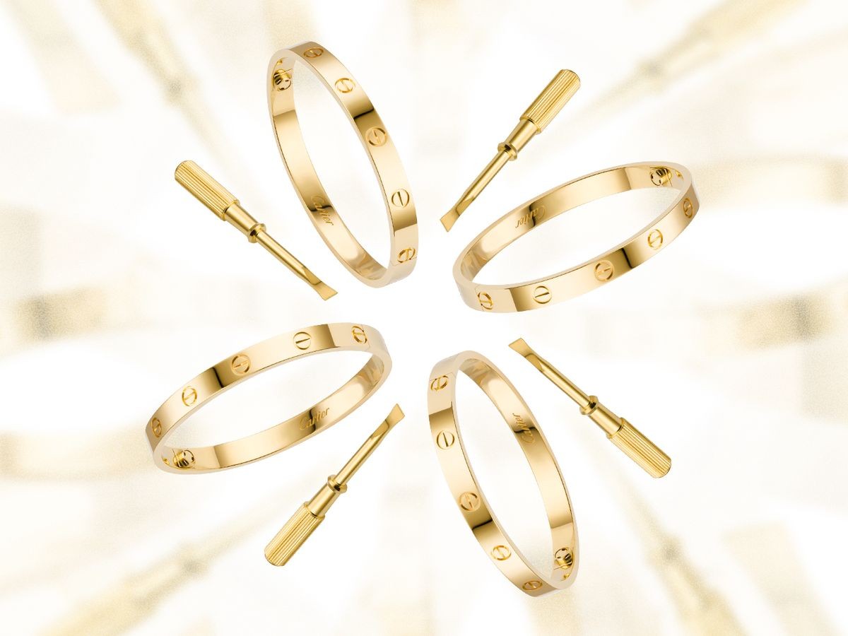卡地亚螺丝手镯于 1969 年首次亮相,灵感来自中世纪的贞操带。其设计特点是两条相互交错的黄金带通过独特的螺丝固定在一起。卡地亚希望打造一款奢华、现代的珠宝作品,同时又能体现承诺和激情的精神。