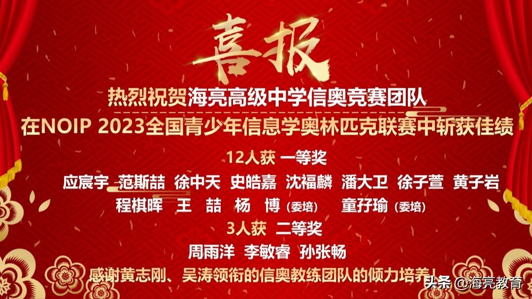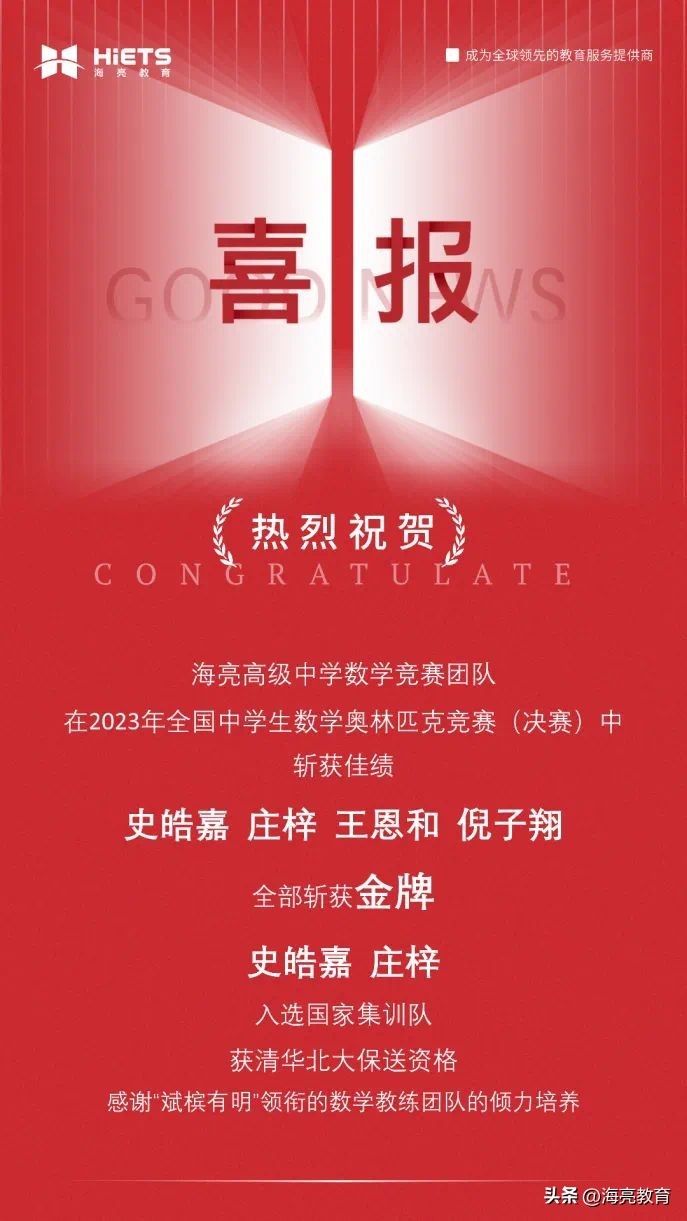 在2023年全国中学生数学奥林匹克竞赛(CMO)决赛中,史皓嘉、庄梓、王恩和、倪子翔4位同学作为浙江省队代表参赛,最终全部斩获金牌,其中,史皓嘉、庄梓入选国家集训队,获得清华北大保送资格。海亮高级中学数学学科竞赛近五年已获得15块CMO金牌。