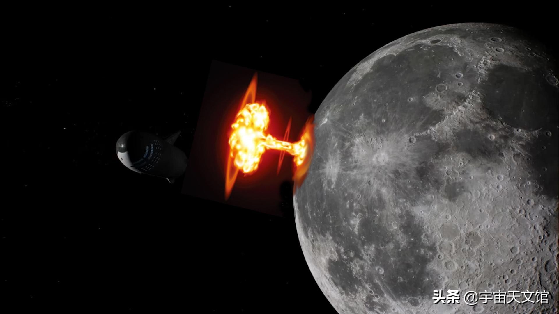 相当于地球有史以来最强大的炸弹的两倍。当它将要撞击月球表面时,氢弹里面首先是作为引爆装置的原子弹采用核裂变爆炸,产生数千万度的高温,促使氘氚等氢核急剧聚变,就像恒星内核发生的那样,几十毫秒后,氢弹发出巨大能量。