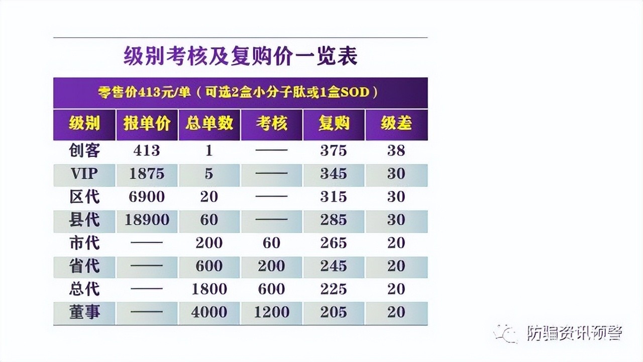 公司采用新零售模式,奖金秒结秒领。小分子肽:2盒/413元/单,SOD:1盒/413元/单)。运营费14元/单,净营业额:399元/单。级别考核一览表如下图: