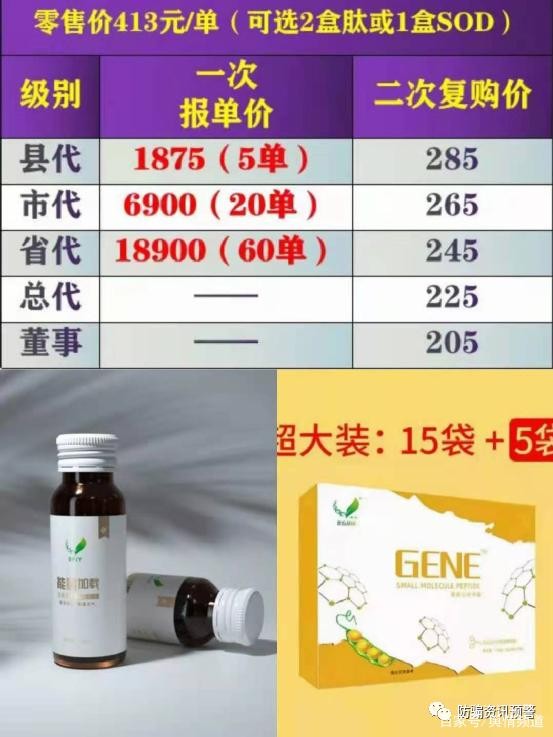 此种宣传方式和北方基因之前鼓吹小分子肽的健康革命作用如出一辙,也与我国广告法、食品安全法的相关规定南辕北辙。小编同时从其经销商处了解到,其在市场推广上并不是简单的产品销售模式,也不是传统的区域代理模式,而是有一套高达8层的财富分配计划。