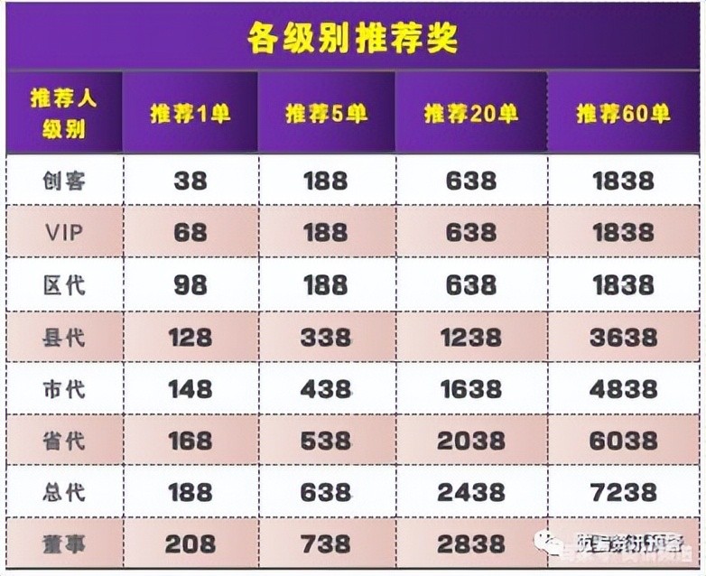 列一:您是市代,推荐一个创客收入为:38+30+30+30+20=148元如下图: