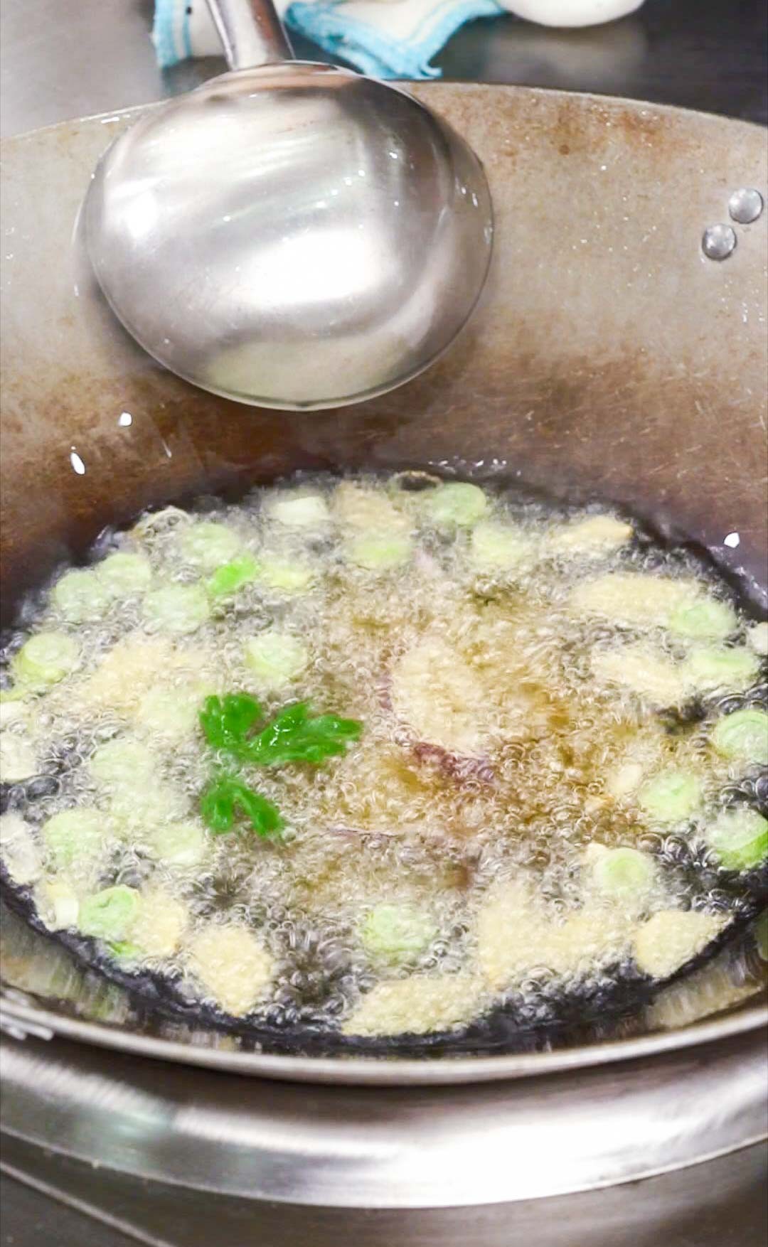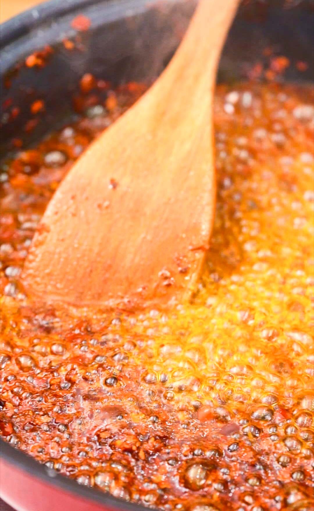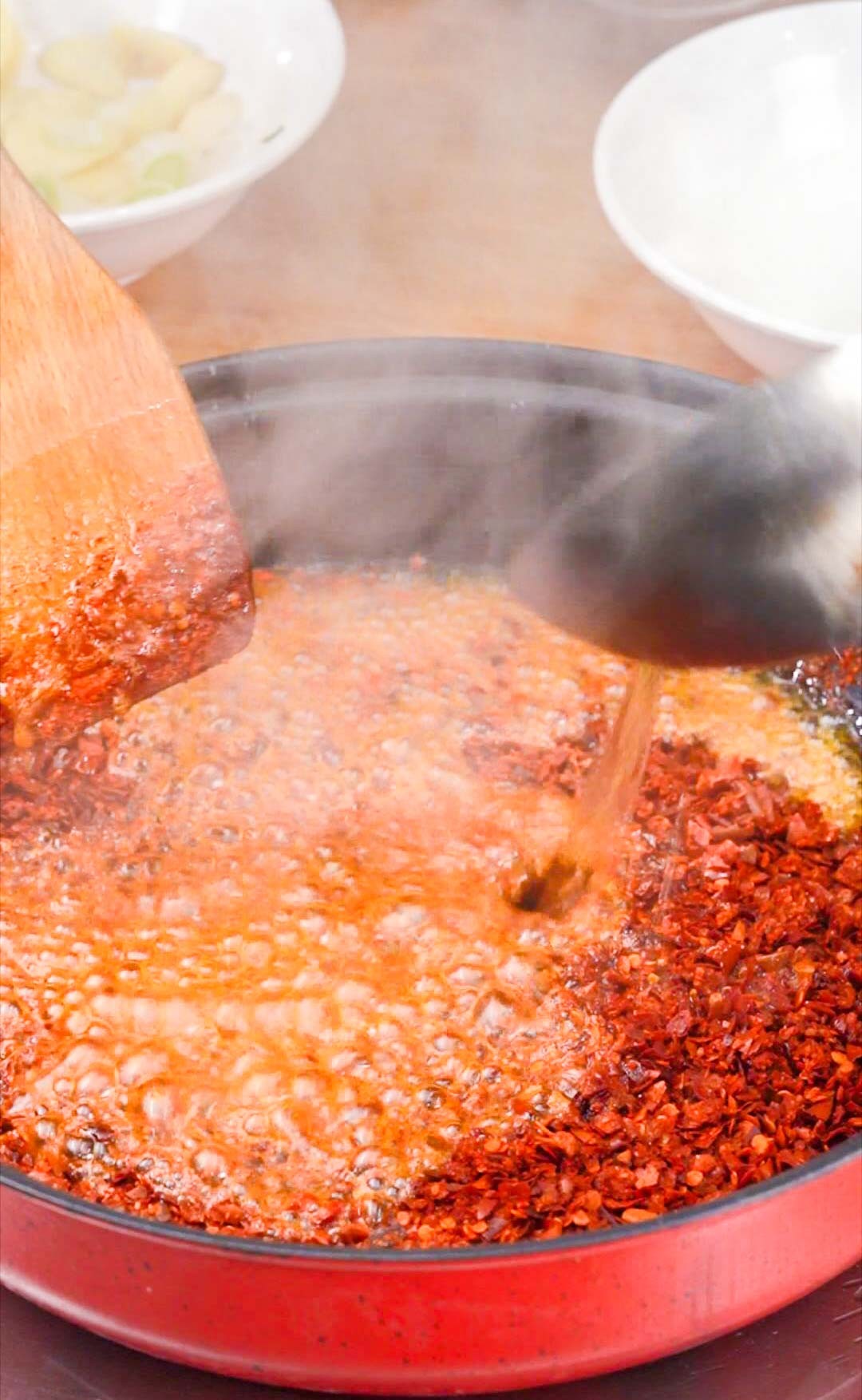 如果筷子表面冒泡速度变快,此时油温7成热适合浇辣椒面。我们就可以将火关闭,用勺子盛热油浇入辣椒面中。
